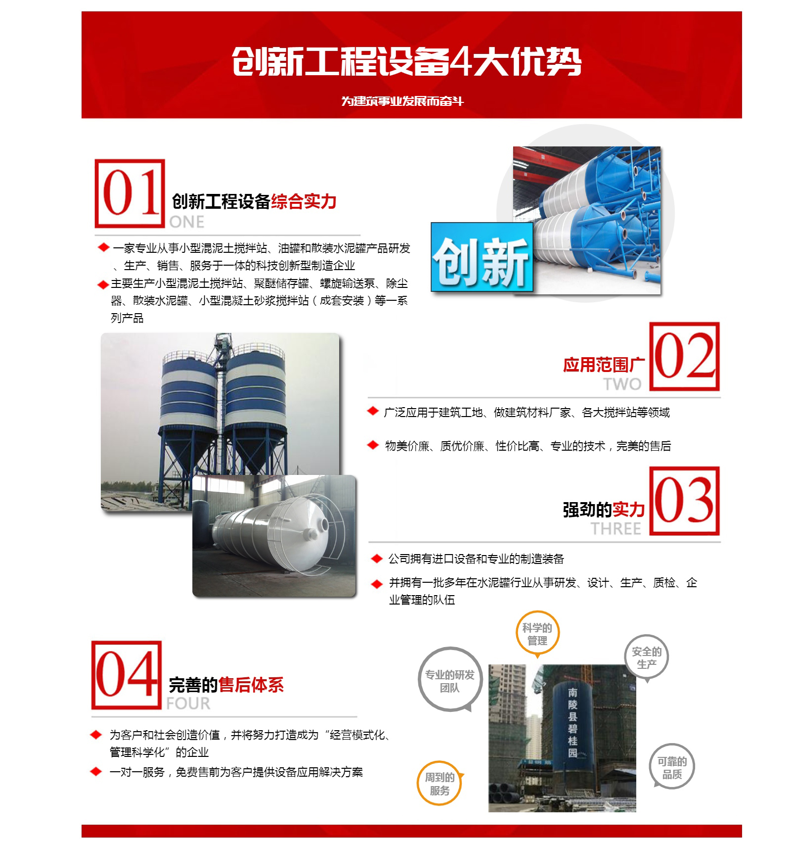 南陵縣創新工程設備機械廠是一家專業從事小型攪拌站、油罐和散裝水泥罐產品研發、生產、銷售、服務于一體的科技創新型制造企業。公司成立于2002年,主要產品有:小型攪拌站、聚醚儲存罐、螺旋輸送泵、除塵器、散裝水泥罐、小型混凝土砂漿攪拌站(成套安裝)等一系列產品,同時為砂漿企業提供專業的投資咨詢、建廠指導、上門制作砂漿罐、技術培訓等一條龍服務,公司提供小型攪拌站服務,可現場安裝,直至送達現場(送達省市:皖、江...